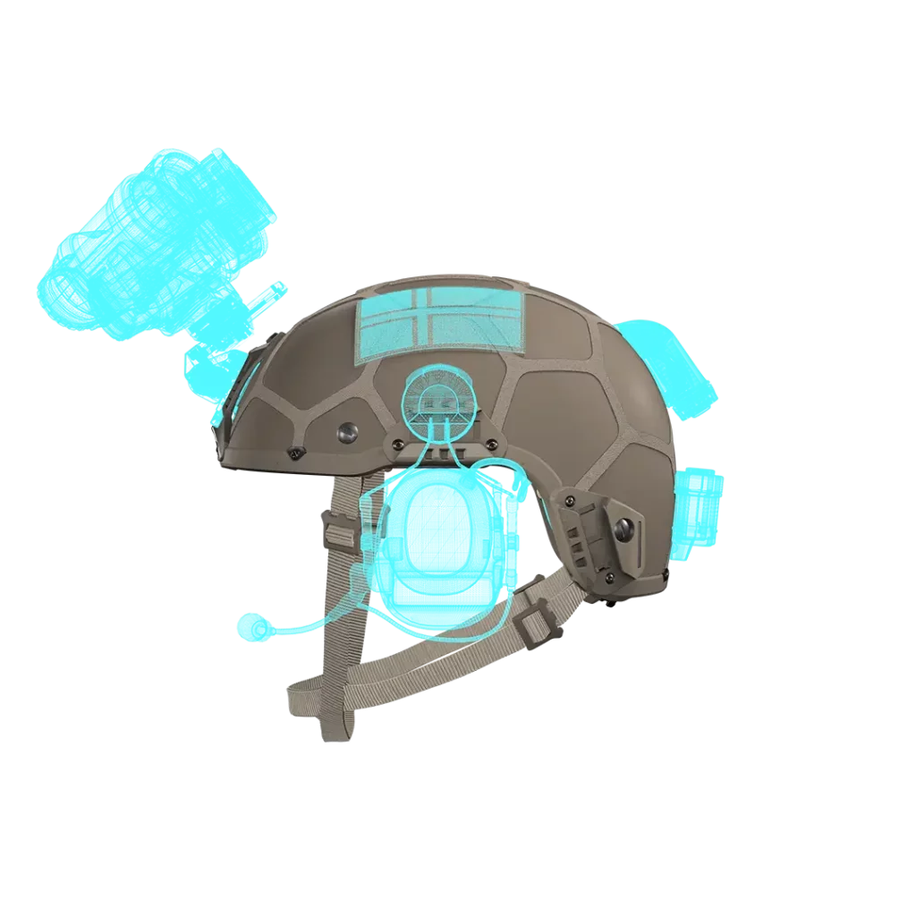 Our helmet system is compatible with most of accessories available on the market, ensuring seamless integration with various communication systems and horizontal accessory attachment options such as Peltor™, ComTac™rail mounts.